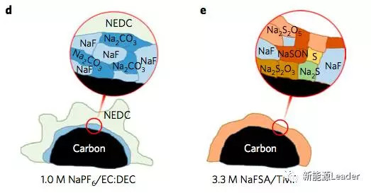 一款電解液獲得良好的電化學(xué)性能的基礎(chǔ)是在負(fù)極上形成穩(wěn)定的SEI膜,傳統(tǒng)的有機(jī)電解液在負(fù)極表面形成的是由有機(jī)/無(wú)機(jī)顆粒組成的混合SEI膜,這層SEI膜中的有機(jī)成分的穩(wěn)定性較差,這也是影響鋰離子電池?zé)岱€(wěn)定性的重要因素。Jianhui Wang研發(fā)的這款高濃度NaFSA/TMP電解液(3.3M),在負(fù)極硬碳表面形成的則主要為無(wú)機(jī)成分的SEI膜,因此SEI膜的熱穩(wěn)定性得到了極大的提高。