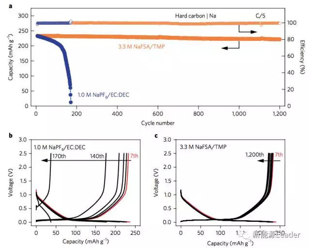 在上面談了那么多關(guān)于安全的問(wèn)題,最終還是要回歸到電解液的本質(zhì)上來(lái),也就是它的電化學(xué)性能。以往的鈉離子電池電解液因?yàn)闊o(wú)法在硬碳表面形成穩(wěn)定的SEI膜,因此導(dǎo)致循環(huán)性能較差,這種情況在電解液中加入阻燃劑后將更加嚴(yán)重(阻燃劑會(huì)影響SEI的形成),但是Jianhui Wang研發(fā)的這款高濃度的NaFSA/TMP電解液卻保持了優(yōu)異的循環(huán)性能。從下圖可以看到,在C/5倍率下循環(huán)1200次后,電池的容量沒有明顯的下降(容量保持率95%)。