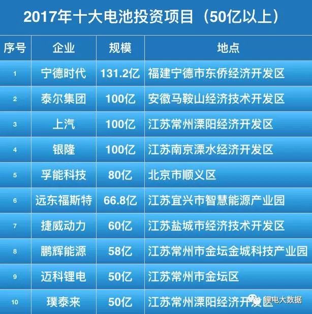 中國(guó)儲(chǔ)能網(wǎng)訊:受到新能源汽車快速發(fā)展的影響,2017年鋰電行業(yè)資本動(dòng)作頻頻,新建、擴(kuò)產(chǎn)項(xiàng)目投資火爆,下面盤點(diǎn)了2017年超過(guò)50億的投資項(xiàng)目。