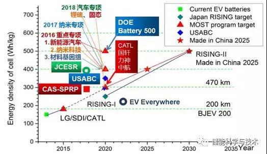 為應(yīng)對(duì)新能源汽車越來越急迫的高性能需求,各國(guó)都已經(jīng)開始布局高能量密度鋰電池, 如日本政府提出,2020年動(dòng)力電池電芯能量密度將達(dá)到250 W·h/kg,2030年達(dá)到500 W·h/kg;美國(guó)先進(jìn)電池聯(lián)合會(huì)(USABC)提出將2020年電芯能量密度由原來的220 W·h/kg提高至350 W·h/kg;中國(guó)國(guó)務(wù)院發(fā)布的《中國(guó)制造2025》中明確提出,2020年中國(guó)動(dòng)力電池單體比能量達(dá)到300 W·h/kg,2025年達(dá)到400 W·h/kg,2030年達(dá)到500 W·h/kg。美國(guó)Battery500項(xiàng)目提出,2020年研制出能量密度達(dá)到500 W·h/kg的動(dòng)力電池樣品。提高電芯能量密度,必然要求兼顧安全性,因此發(fā)展全固態(tài)鋰二次電池技術(shù),具有重要的意義。