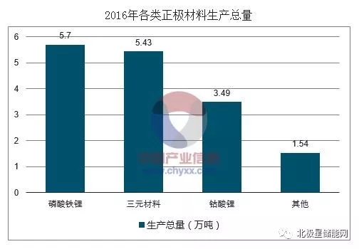 受動(dòng)力型鋰電池需求的快速增長(zhǎng),促進(jìn)動(dòng)力型鋰電池正極材料的快速發(fā)展。目前國內(nèi)動(dòng)力型鋰電池主要以鐵系和三元系為主,故近兩年磷酸鐵鋰和三元材料成為鋰電池正極材料中增長(zhǎng)最快的兩種材料。2016年兩者的出貨量增速均超過45%,具體來看,磷酸鐵鋰的產(chǎn)量5.7萬噸,同比增長(zhǎng)75%,磷酸鐵鋰大幅增長(zhǎng)主要受動(dòng)力電池及儲(chǔ)能鋰電池帶動(dòng)。三元材料產(chǎn)量5.43萬噸,同比增長(zhǎng)49%,增長(zhǎng)主要受新能源乘用車、鋰電自行車、中低端數(shù)碼鋰電池等市場(chǎng)帶動(dòng),其中,磷酸鐵鋰目前在正極材料生產(chǎn)總量中占比最大,2016年占比達(dá)到35.27%。