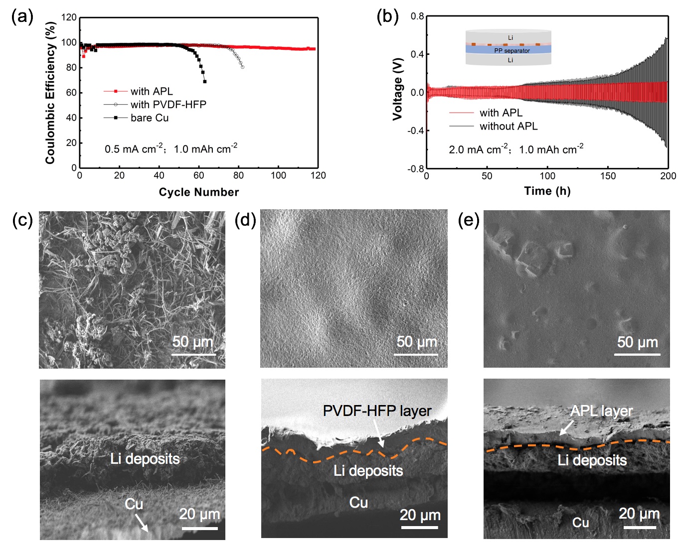 為了構(gòu)建穩(wěn)定的金屬鋰/電解液界面,調(diào)控鋰的均勻沉積,該課題組提出以無機(jī)LiF為剛性組分,以PVDF-HFP聚合物為柔性組分來構(gòu)建“剛?cè)嵯酀?jì)”的復(fù)合膜,以在電化學(xué)循環(huán)過程中穩(wěn)定金屬鋰與電解液的界面。其中,柔性聚合物提供的柔性和可伸縮性可承受金屬鋰電極沉積/溶解過程中的界面波動(dòng),而剛性組分的引入可進(jìn)一步提升修飾層的機(jī)械模量,從而抑制鋰枝晶生長(zhǎng),實(shí)現(xiàn)鋰的均勻沉積。將這種同時(shí)具有好的形變性能、高的機(jī)械模量和離子導(dǎo)率的界面修飾層引入到紐扣電池中后,Li-Cu半電池、Li-Li對(duì)稱電池的循環(huán)壽命以及循環(huán)穩(wěn)定性都顯著提升;與磷酸鐵鋰正極匹配的全電池測(cè)試中,復(fù)合層修飾后的電池循環(huán)壽命提升了2.5倍。