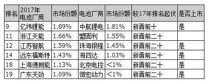 2017年出現(xiàn)了5家排名退步的企業(yè),2家退步明顯,主要受制于磷酸鐵鋰電池技術(shù)路線和產(chǎn)能不足。比亞迪和珠海銀隆均是退步一點(diǎn)點(diǎn),前者主要受行業(yè)產(chǎn)品配套因素及產(chǎn)品技術(shù)路線轉(zhuǎn)型的影響,后者則可能在于小眾動(dòng)力電池產(chǎn)品(鈦酸鋰)的限制,需求總體量不大。