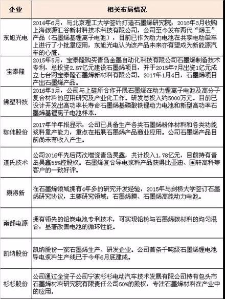 雖然石墨烯電池在鋰電領(lǐng)域的盈利前景未明,但是還是有諸多上市企業(yè)爭相布局。據(jù)高工鋰電不完全統(tǒng)計(jì),包括東旭光電、寶泰隆、佛塑科技、珈偉股份、杉杉股份、道氏技術(shù)、凱納股份、南都電源、康得新等都在布局鋰電池材料領(lǐng)域的石墨烯電池。