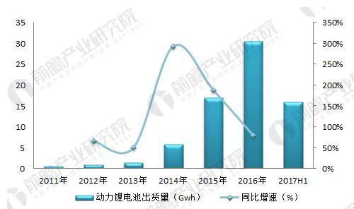 圖表4:2011-2017年國(guó)內(nèi)動(dòng)力鋰電池出貨量變化(單位:Gwh,%)