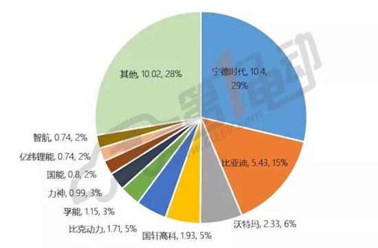 我們之前測(cè)經(jīng)測(cè)算過2017年國(guó)內(nèi)幾大動(dòng)力電池企業(yè)的產(chǎn)品裝機(jī)量,也就是實(shí)實(shí)在在裝在車上的電池量。從總量上看,比亞迪和寧德時(shí)代這兩家企業(yè)瓜分了全國(guó)約44%的市場(chǎng)份額。