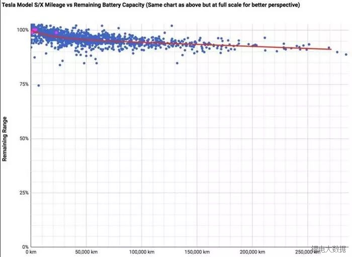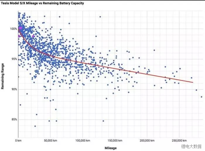 特斯拉論壇內的一群車主正從全球350多輛特斯拉汽車處采集相關的數(shù)據(jù),并將其研究發(fā)現(xiàn)頻繁更新到谷歌的公共文件內。該數(shù)據(jù)清楚地表明,在經歷了5萬英里(約10萬公里)行駛里程后,大多數(shù)特斯拉車載蓄電池容量的衰減率將達到5%,隨著行駛里程數(shù)的增長,電池的容量將趨于平穩(wěn)狀態(tài),看起來似乎不太會再衰減5%。