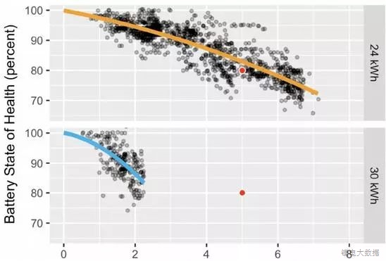 他(她)們將部分處于異常值(outlier)的蓄電池組剔除在外,然后將直流快充及每日的充電狀態(tài)等其他數(shù)據(jù)納入考量范圍,想找出電池衰減的原因及各因素間的關聯(lián)性。然而,目前還沒有跡象表明這類因素會對其數(shù)據(jù)造成重大影響。