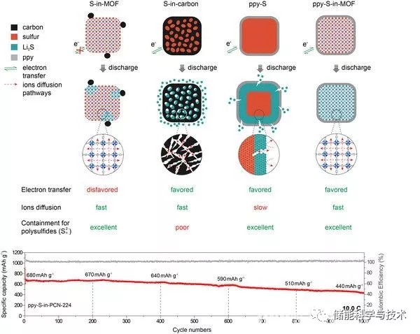 長期以來,MOF材料的應(yīng)用集中在氣體分離、存儲、催化等領(lǐng)域。受導(dǎo)電性限制,MOF在電化學(xué)應(yīng)用方面的關(guān)注較少。如何充分發(fā)揮MOF極性孔道傳輸離子的優(yōu)勢,提升導(dǎo)電性具有決定性意義。傳統(tǒng)路徑是直接設(shè)計(jì)合成導(dǎo)電MOF,研究人員沒有采用這一路徑,而是將導(dǎo)電聚合物與MOF復(fù)合,成功將導(dǎo)電率提升7個(gè)數(shù)量級。該復(fù)合材料作為鋰硫電池陰極,在10.0 C(16.8 A/g)大電流密度下充放電循環(huán)1000次后仍有440 mAh/g的容量,倍率性能優(yōu)于傳統(tǒng)碳基載硫材料。通過對比多種孔道拓?fù)浣Y(jié)構(gòu),研究人員首次發(fā)現(xiàn)了MOF的孔道結(jié)構(gòu)對其高倍率下的電化學(xué)性能有重要影響,具有通透十字交叉結(jié)構(gòu)的MOF非常利于離子擴(kuò)散,其大倍率充放電性能最佳。