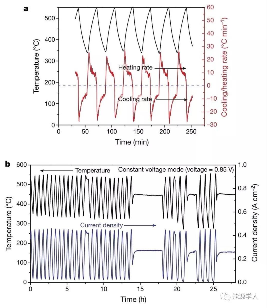 圖4 在260°C和550°C之間循環(huán)使用氫燃料的PCFC循環(huán)的熱循環(huán)測量