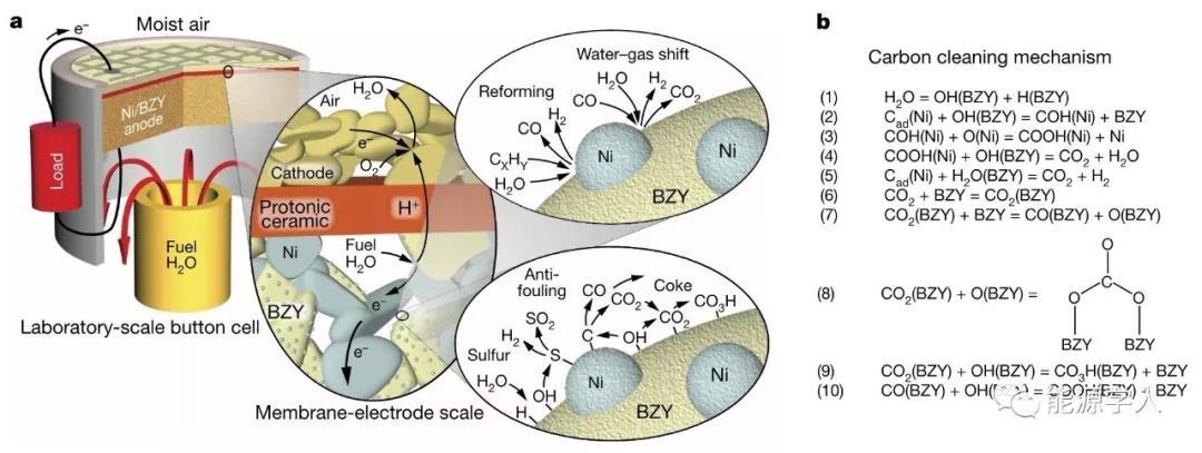圖2 (a) PCFC和烴重整機理,水煤氣轉(zhuǎn)換反應(yīng),硫清洗和碳清洗的示意圖;(b)碳清潔機理