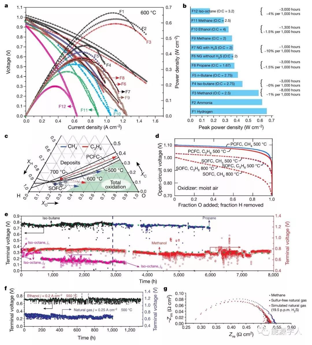 來自科羅拉多州礦業(yè)大學(xué)的Chuancheng Duan(一作,中文名可能是段傳成,2012年畢業(yè)于大連理工,畢業(yè)后在大連化物所1年)和Ryan O’Hayre(通訊)等人在不對電池結(jié)構(gòu)進行更改的基礎(chǔ)上,使用了11種燃料對質(zhì)子陶瓷燃料電池進行了測試,對PCFC進行了系統(tǒng)的研究。
