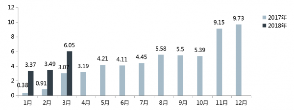 2017.1-2018.3新能源乘用車PACK產量(萬套)