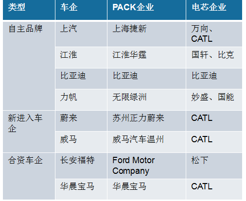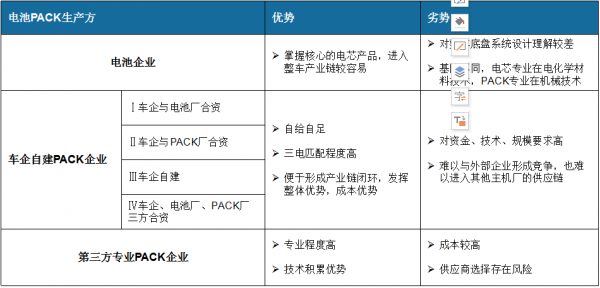 目前乘用車動力電池PACK市場參與企業(yè)主要有三種類型,車企、電池企業(yè)、專業(yè)第三方PACK生產企業(yè),三種類型企業(yè)在PACK環(huán)節(jié)市場上各有優(yōu)劣。