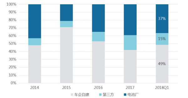 2014-2018Q1新能源乘用車動力電池PACK市場占比(%)