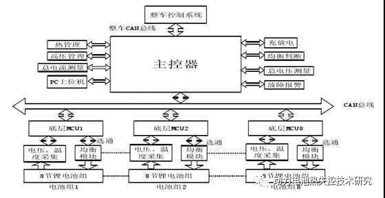 動力電池管理系統(tǒng),只有一層集中式或者兩分布式,基本不會出現(xiàn)三層的情況。小型車主要應用一層集中式電池管理系統(tǒng)。兩層的分布式動力電池管理系統(tǒng),如下圖所示。