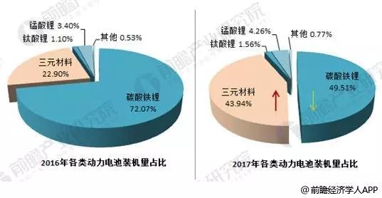 從動(dòng)力鋰電池的類型來看,主要分為碳酸鐵鋰、三元材料、鈦酸鋰、錳酸鋰和其他。現(xiàn)階段以碳酸鐵鋰和三元材料為動(dòng)力鋰電池的主要裝機(jī)類型。但是相比于2016年,2017年三元材料動(dòng)力電池的裝機(jī)量占比有較大幅度的提升,占比達(dá)43.94%,而碳酸鐵鋰裝機(jī)量下降至49.51%。