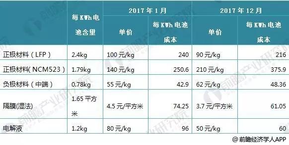 圖表10:2017年中國(guó)動(dòng)力鋰電池材料成本分析(單位:元/kg,元/平方米)