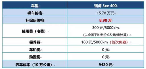 今年以來,新能源汽車銷量節(jié)節(jié)攀高。近日,奇瑞瑞虎3XE400及小螞蟻300聯(lián)動齊發(fā),在上海正式上市,瑞虎3XE400最高續(xù)航445KM,0-50KM/h加速4S內(nèi),煥新小螞蟻300更是完成了23項(xiàng)優(yōu)化升級,60KM/h等速情況下續(xù)航里程達(dá)到310公里,再次樹立了同級電動汽車行業(yè)標(biāo)桿。兩款產(chǎn)品憑借各自卓越性能以及突出的性價(jià)比,吸引無數(shù)目光。下表為瑞虎3XE400使用成本表現(xiàn)。