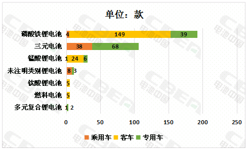 從配套電池類型來看,本批推薦目錄353款車型配套電池類型以磷酸鐵鋰電池和三元電池為主,配套款數(shù)分別為192款和106款,占比分別為54%和30%。其它電池類別配套款數(shù)分別為:錳酸鋰電池配套31款、燃料電池和鈦酸鋰電池分別配套5款、多元復合鋰電池配套3款和未注明類別鋰電池配套有11款。