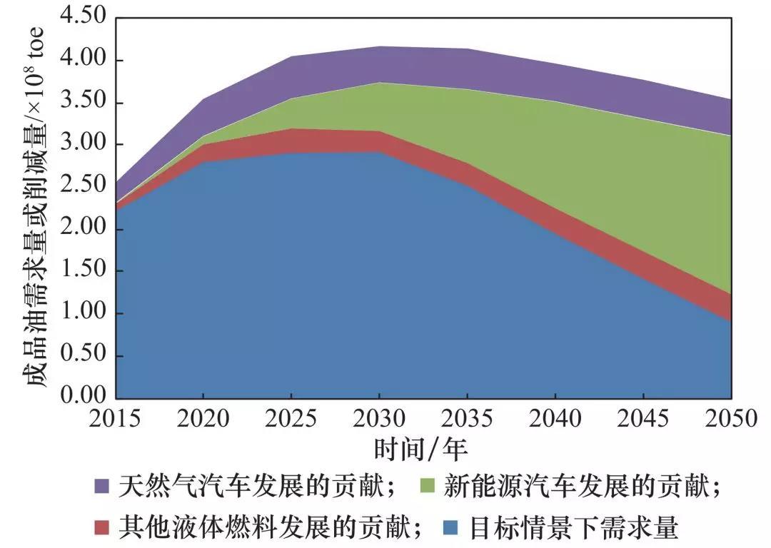 圖 2 大力發(fā)展燃料替代與新能源汽車(chē)對(duì)汽車(chē)成品油需求削減量的貢獻(xiàn)