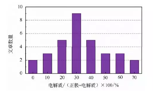 圖5. 2017 年發(fā)表的全固態(tài)鋰電池中固態(tài)電解質(zhì)與正極活 性材料加固態(tài)電解質(zhì)材料的質(zhì)量占比的文章數(shù)量統(tǒng)計(jì)
