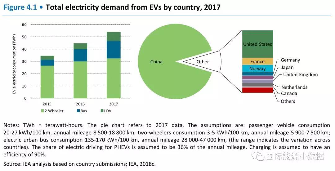 根據(jù)國(guó)際能源署(IEA)最新發(fā)布的全球電動(dòng)車(chē)展望報(bào)告中的分析,2017年全球電動(dòng)車(chē)耗電54TWh(540億千瓦時(shí)),比2016年增長(zhǎng)21%。全球電動(dòng)車(chē)的電耗大約相當(dāng)于希臘的電力消費(fèi),占全球電力消費(fèi)的0.2%。在中國(guó)和挪威這兩個(gè)電動(dòng)車(chē)存量最大的國(guó)家,電動(dòng)車(chē)的電耗分別占全國(guó)電力消費(fèi)的0.45%和0.78%。