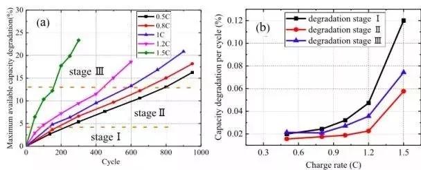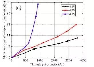從數(shù)據(jù)可以看到,隨著充電的倍率的加大,鋰離子電池的衰降速率也在快速增加,并且從曲線的斜率來看,電池的衰降速度存在三個不同的階段,前期衰降速度較快的階段(階段1),中間衰降速度較慢的穩(wěn)定階段(階段2),和后期的衰降速率加速階段(階段3)。針對三個階段電池的衰降機理的研究認為,階段1可能是因為電池SEI膜生長需要消耗一部分Li+,因此衰降速度較快。在階段2隨著SEI膜結(jié)構(gòu)的穩(wěn)定,內(nèi)部較為穩(wěn)定,因此衰降速度較慢,在階段3隨著電池老化,開始發(fā)生活性物質(zhì)損失,電極活性界面減少,導致電池對于電流十分敏感。圖C是針對不同的截止電壓對電池衰降速度影響的實驗,從實驗結(jié)果可以看到,當把充電截止電壓提高到4.3V時會導致電池的循環(huán)性能急劇惡化,降低充電截止電壓可以有效的改善電池的循環(huán)性能。