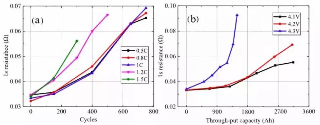 對電池的動態(tài)內(nèi)阻分析如圖所示,從圖a測試結(jié)果來看,當充電電流小于1C時,電池動態(tài)內(nèi)阻隨著電池循環(huán)的變化趨勢幾乎時一樣的,但是當充電電流超過1C時,電池動態(tài)內(nèi)阻增加速度會隨著充電速率的增加而快速增加。從圖b的測試結(jié)果來看,當充電截止電壓為4.3V時,電池動態(tài)內(nèi)阻增加非常迅速表明高截止電壓會惡化電池的動力學條件,截止電壓為4.1V和4.2V時電池動態(tài)內(nèi)阻增加較為緩慢。