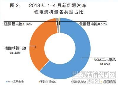 數(shù)據(jù)顯示,2018年1-4月新能源汽車鋰電裝機(jī)量8.23GWh,同比增長(zhǎng)212.91%。從各類型鋰電看,NCM三元電池裝機(jī)以5.07 GWh占比61.65%,排在第一位。磷酸鐵鋰電池以2.98GWh占比36.23%,排在第二位,市場(chǎng)份額已經(jīng)萎縮至不到四成;錳酸鋰電池以128.76 MWh占比1.56%,排在第三位;鈦酸鋰電池以45.80 MWh占比0.56%,排在最后(見圖2)。
