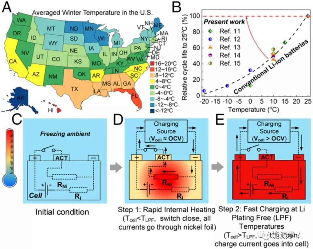 圖1. 實(shí)現(xiàn)不受溫度影響的快速充電基本思路。A) 美國各個州的冬季平均氣溫;B) 現(xiàn)有文獻(xiàn)中,不同溫度下循環(huán)壽命的相關(guān)數(shù)據(jù)(以25 oC進(jìn)行歸一化處理);C-E) 用于無鋰沉積電池的快速充電可控單元結(jié)構(gòu)的原理示意圖。