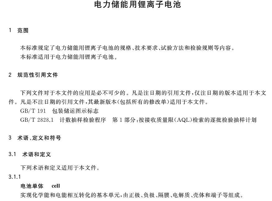 中國儲能網(wǎng)訊:《電力儲能用鋰離子電池》標(biāo)準(zhǔn)于2018-06-07發(fā)布,2019-01-01起開始實施。