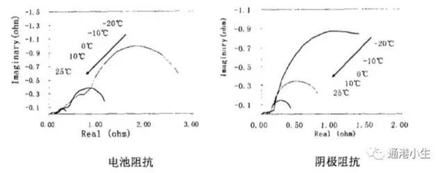 電池阻抗主要體現(xiàn)為電化學(xué)反應(yīng)阻抗,而歐姆阻抗相對較小。由下圖可知。隨著溫度的下降,電池阻抗逐漸上升,且下降至0°C以后,阻抗速度增大,陰極阻抗呈類似的趨勢,從數(shù)值上來看,電池的阻抗主要來源于陰極阻抗的貢獻(xiàn)。