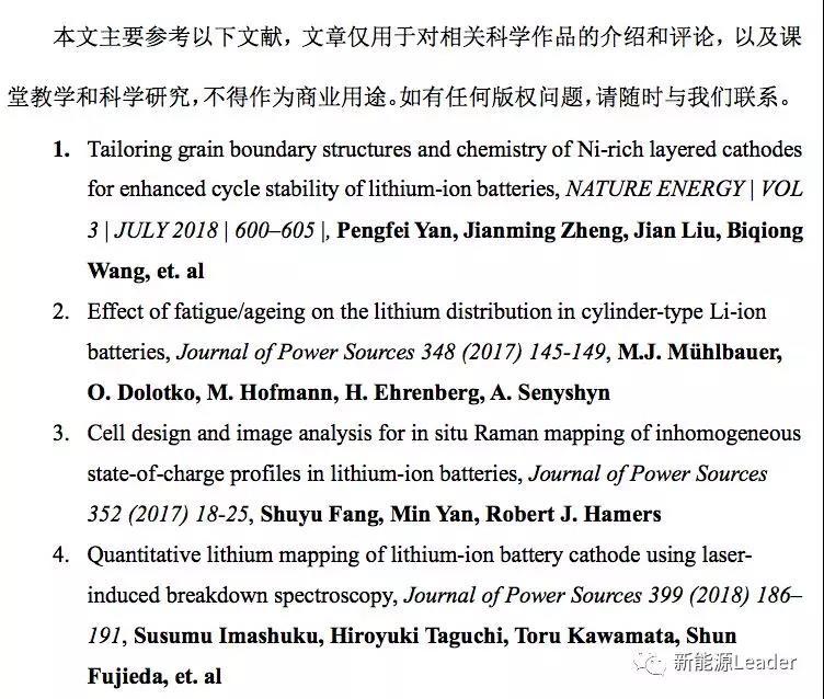 正極材料嵌鋰不均勻性是必然發(fā)生的,但是如何分析和檢測(cè)就成了關(guān)鍵,Li屬于輕元素,常規(guī)的EDS工具無(wú)法分析Li元素的分布,為了解決這一問(wèn)題,人們首先嘗試采用中子衍射的方式檢測(cè)Li在鋰離子電池內(nèi)部的分布,中子體積小,并且不帶電,因此具有很強(qiáng)的穿透力,能夠輕易的穿過(guò)鋰離子電池的外殼,而H和Li等輕元素與中子質(zhì)量接近,因此更容易與中子發(fā)生相互作用,因此中子衍射技術(shù)對(duì)于電池中的Li分布和電解液分布非常敏感,德國(guó)Helmholtz化學(xué)儲(chǔ)能研究所(HIU)和卡爾斯魯厄理工學(xué)院的M.J. Mu?hlbauer等人利用中子衍射技術(shù)分析了鋰離子電池在壽命末期時(shí)Li在鋰離子電池內(nèi)部的分布情況【2】(《電池老化對(duì)Li在鋰離子電池內(nèi)部分布的影響》),研究表明在壽命的末期不僅僅鋰離子電池內(nèi)部的活性Li減少了,更重要的是剩余的活性Li在鋰離子電池內(nèi)部還出現(xiàn)了分布不均的現(xiàn)象。