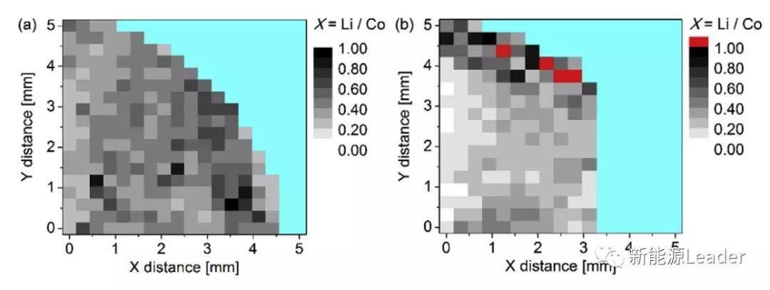 Susumu Imashuku首先測(cè)試了Li/Co比為0,0.01,0.10,0.30,0.51,0.62,0.80和0.99的標(biāo)準(zhǔn)樣品的光譜,作為后續(xù)分析的基線。下圖為作者采用LIBS定量分析得到的LCO正極的Li/Co比分布圖(圖a為循環(huán)30次后,圖b為循環(huán)50次后),從圖中能夠看到在循環(huán)30次后Li的分布還是相對(duì)比較均勻的,但是在循環(huán)50次后LCO正極的中間位置Li濃度較低,而邊緣Li濃度較高,甚至在邊緣的一些位置出現(xiàn)了Li/Co比大于1的情況(紅色點(diǎn)),通過(guò)EDS分析發(fā)現(xiàn),在LCO正極的邊緣位置F和P元素濃度較高(F和P都是常見(jiàn)的電解液分解產(chǎn)物),邊緣的Co元素濃度要比中心位置稍低,作者認(rèn)為這是由于正極邊緣位置的LCO發(fā)生過(guò)充,導(dǎo)致部分Co元素發(fā)生了溶解,從而導(dǎo)致邊緣位置的Li/Co比高于1。