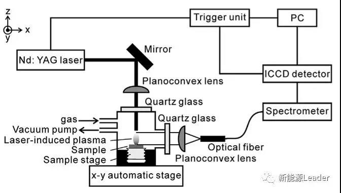Susumu Imashuku在試驗(yàn)中采用的測(cè)試系統(tǒng)如下圖所示,激光源為Nd: YAG,激光波長(zhǎng)為532nm,脈沖時(shí)間為16-18ns,單個(gè)脈沖能量為20mJ,系統(tǒng)中包含兩套光譜分析儀,其中一套能夠采集較寬的波長(zhǎng)范圍(200-895nm),用來(lái)采集Li的發(fā)射光譜,另外一套對(duì)短波更為敏感(13.3nm),用來(lái)采集短波光譜信號(hào)。