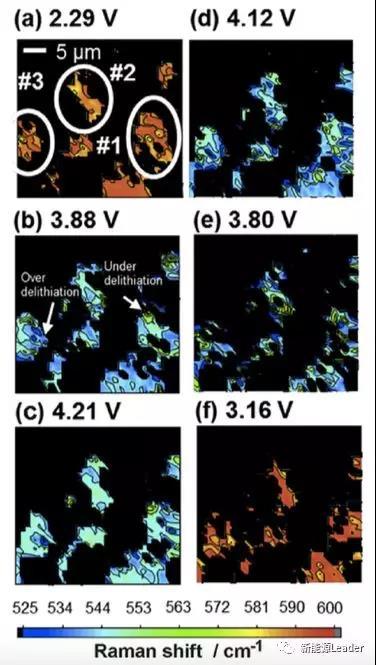 Shuyu Fang的分析和計(jì)算表明在單個(gè)NMC顆粒內(nèi)部也存在不均勻的現(xiàn)象,例如下圖a中的顆粒1#在3.88V時(shí),顆粒的大部分區(qū)域的A1g峰的位置在540/cm負(fù)極,而頂部的區(qū)域卻在590/cm負(fù)極,表明這部分區(qū)域嵌鋰反應(yīng)比較滯后。對(duì)比不同顆粒發(fā)現(xiàn),1#和3#顆粒之間也存在較大的不均勻性,例如在3#顆粒達(dá)到3.84V時(shí),1#顆粒已經(jīng)達(dá)到了4.01V,兩個(gè)顆粒之間的電勢(shì)差達(dá)到0.2V,這表明在鋰離子電池正極內(nèi)部顆粒與顆粒之間、顆粒內(nèi)部不同區(qū)域之間都存在較大的嵌鋰不均勻的現(xiàn)象。顆粒之間的嵌鋰不均勻現(xiàn)象會(huì)導(dǎo)致部分顆粒過(guò)充,顆粒內(nèi)部的嵌鋰不均勻現(xiàn)象會(huì)導(dǎo)致顆粒內(nèi)部應(yīng)力累積,導(dǎo)致顆粒產(chǎn)生裂紋,這都會(huì)對(duì)正極材料長(zhǎng)期的循環(huán)穩(wěn)定性產(chǎn)生負(fù)面的影響。