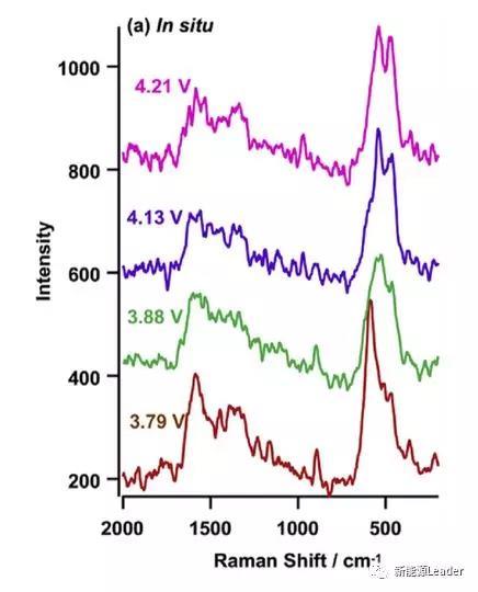 但是中子衍射技術(shù)分辨率較低,只能在電池層面上對(duì)Li分布的均勻性進(jìn)行分析,而導(dǎo)致正極材料內(nèi)部應(yīng)力積累的是單個(gè)顆粒內(nèi)部的鋰離子電池分布不均勻現(xiàn)象。為了分析單個(gè)顆粒內(nèi)部Li分布的不均勻問(wèn)題,威斯康星州大學(xué)的Shuyu Fang等人引入了拉曼光譜技術(shù),為了實(shí)現(xiàn)原位觀測(cè)NCM材料在嵌鋰過(guò)程中的Li分布情況,Shuyu Fang制備了特殊結(jié)構(gòu)的扣式電池,下圖為NMC532材料在不同的充電電壓下的拉曼光譜曲線,從圖中能夠看到在595/cm附近的A1g峰的強(qiáng)度會(huì)隨著NMC材料電勢(shì)的升高(脫鋰增加)而降低,隨著正極重新嵌鋰,A1g峰的強(qiáng)度又回重新升高,因此我們可以利用A1g峰的強(qiáng)度估算正極材料內(nèi)部的Li濃度分布。