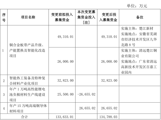 楚江新材向 8 名特定對(duì)象發(fā)行股份 89,889,036 股,發(fā)行價(jià)格為 15.05 元/股。本次非公開發(fā)行股票募集資金總額為 1,352,829,991.80 元,扣除各項(xiàng)發(fā)行費(fèi)用 16,499,889.04 元,募集資金凈額為 1,336,330,102.76 元。投資資金變更前后如下表: