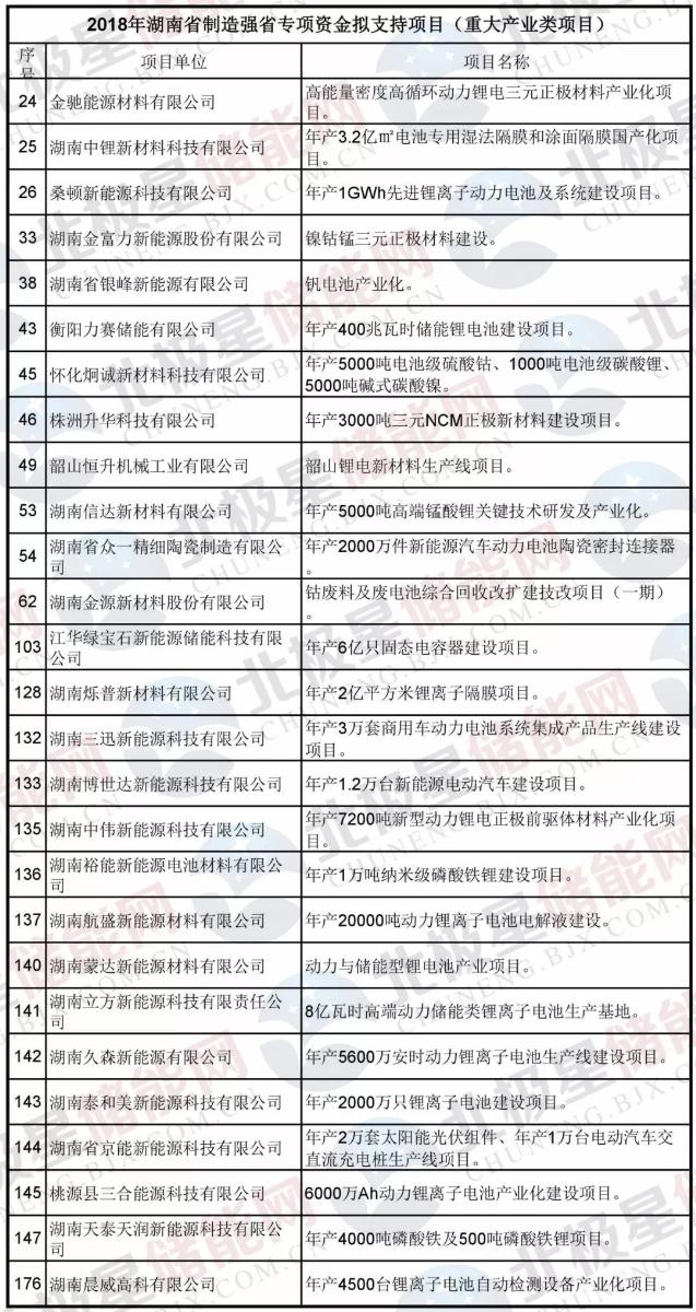 2018年湖南省制造強(qiáng)省專項(xiàng)資金擬支持項(xiàng)目(重大產(chǎn)業(yè)類)中就包含了年產(chǎn)3.2億㎡電池專用濕法隔膜和涂面隔膜國產(chǎn)化、釩電池產(chǎn)業(yè)化、年產(chǎn)400兆瓦時(shí)儲(chǔ)能鋰電池建設(shè)等20多項(xiàng)儲(chǔ)能相關(guān)項(xiàng)目。