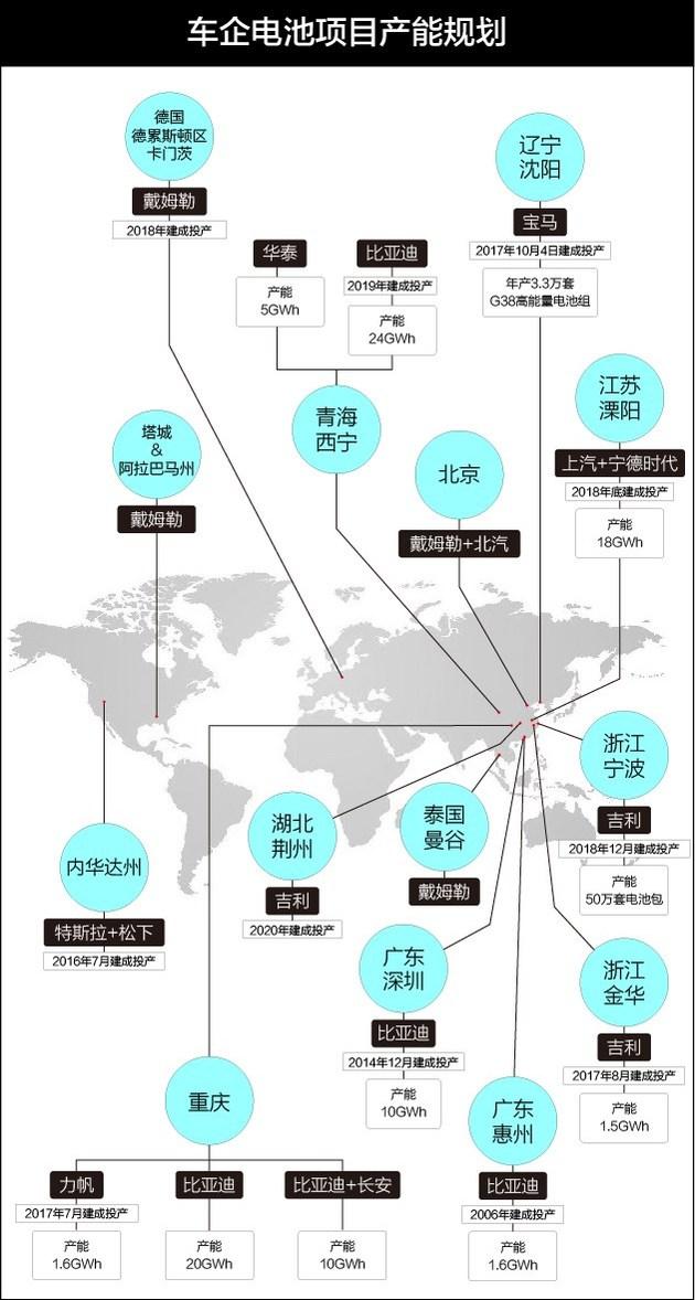 比如,2017年6月19日,上汽集團(tuán)與寧德時(shí)代在江蘇常州溧陽(yáng)的電池生產(chǎn)基地正式奠基,項(xiàng)目一期今年底可實(shí)現(xiàn)投產(chǎn),年產(chǎn)能可達(dá)18GWh,待2020年項(xiàng)目全部投產(chǎn),將形成36GWh年產(chǎn)能。