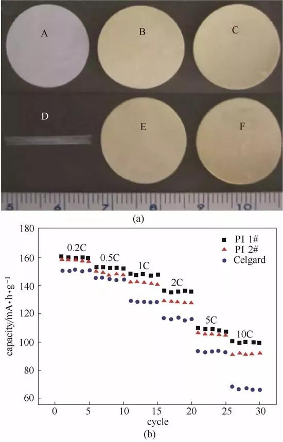 (a)Celgard、PI40μm、100μm隔膜 150℃處理前(a,b,c)后(d,e,f)熱收縮;(b)倍率測(cè)試