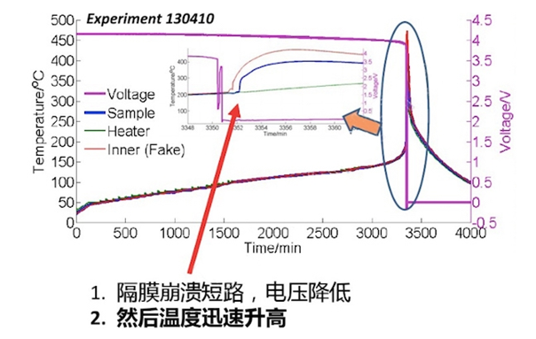 熱濫用主要指在電池中的局部過熱,很少獨立存在,往往是通過機(jī)械濫用和電氣濫用發(fā)展而來,并且是最終直接觸發(fā)熱失控等事故的一種情況。熱濫用一般多為外部環(huán)境高或者在溫度控制系統(tǒng)不起作用下導(dǎo)致的電池?zé)崃窟^高從而造成的短路,從而引發(fā)熱失控。從原因上說,熱濫用的原因是最為復(fù)雜的,電池包的碰撞、損壞,電池內(nèi)部的結(jié)構(gòu)、性能或是其他熱管理系統(tǒng)、空調(diào)系統(tǒng)的失靈都可能導(dǎo)致熱濫用的發(fā)生。