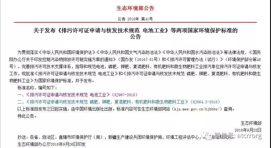 中國儲能網(wǎng)訊:近日,生態(tài)環(huán)境部發(fā)布《排污許可證申請與核發(fā)技術(shù)規(guī)范電池工業(yè)》(HJ 967—2018)(以下簡稱“電池工業(yè)技術(shù)規(guī)范”),和《排污許可證申請與核發(fā)技術(shù)規(guī)范磷肥、鉀肥、復(fù)混肥料、有機肥料及微生物肥料工業(yè)》(HJ 864.2—2018)全面推進這兩個行業(yè)排污許可制度改革。國家排污許可證管理信息平臺上的正式申報模塊也將開啟。