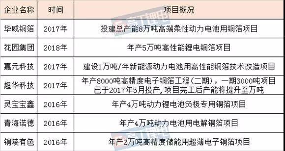 高工鋰電根據(jù)公開信息盤點2016-2018年產(chǎn)能規(guī)劃在萬噸級的鋰電銅箔項目,共計有華威銅箔、花園集團、嘉元科技、超華科技、靈寶華鑫、諾德股份、銅陵有色等8家企業(yè)宣布投建鋰電銅箔項目,規(guī)劃產(chǎn)能總計超過20萬噸。根據(jù)鋰電銅箔的投產(chǎn)周期規(guī)律,新增產(chǎn)能集中在2017年上半年、2018年上半年釋放。