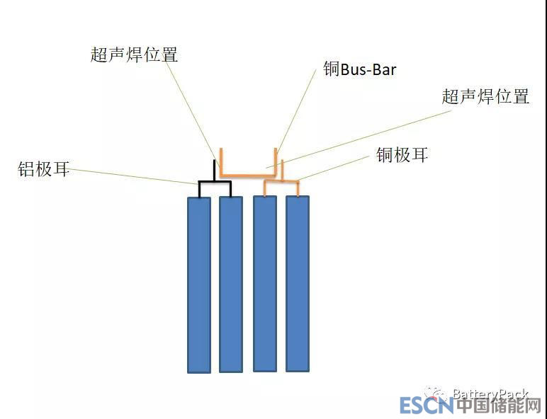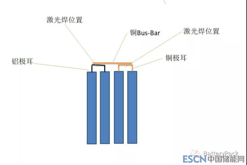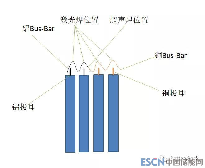 匯流排是由銅薄板和鋁薄板通過超聲焊結(jié)合而成,加工成類正弦波形狀,卡在電芯極耳處,銅匯流排處對應(yīng)的是負(fù)極極耳,鋁匯流排處對應(yīng)的是正極極耳,然后通過激光焊連接。