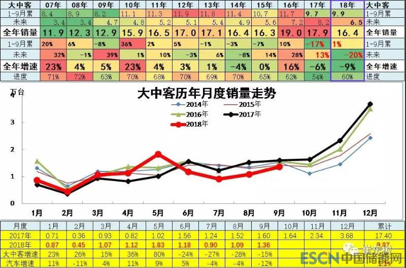 17年的大中客市場(chǎng)走勢(shì)是歷年波動(dòng)最大的,1-5月增速處于歷年低谷,6月開始改善較大,年末超強(qiáng)。18年1到5月份,大中客表現(xiàn)較強(qiáng),同比增長出現(xiàn)高增長,增長主要是因?yàn)樾履茉窜嚨膿屟a(bǔ)貼行情,同時(shí)也是目錄較好的。6-9月調(diào)整也是較合理的走勢(shì)。