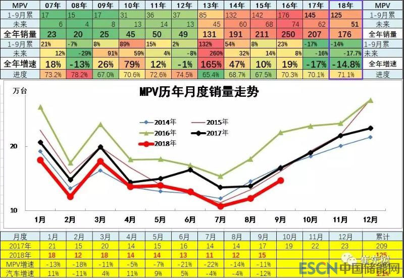 18年MPV銷量109.54萬臺(tái),累計(jì)增速-14.8%;18.8月銷量11.93萬臺(tái),同比增長-13.6%,環(huán)比增長11.9%。