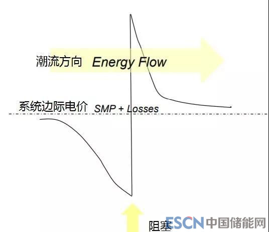 2.重視阻塞帶來的風(fēng)險:節(jié)點電價精準(zhǔn)的價格信號的另一面就是阻塞成本波動性強且難以預(yù)測。如下圖所示(圖例來自PJM),阻塞出現(xiàn)后會在阻塞兩側(cè)形成巨大的價差。按潮流方向,在阻塞前側(cè)的節(jié)點電價較低而阻塞后側(cè)節(jié)點電價很高。