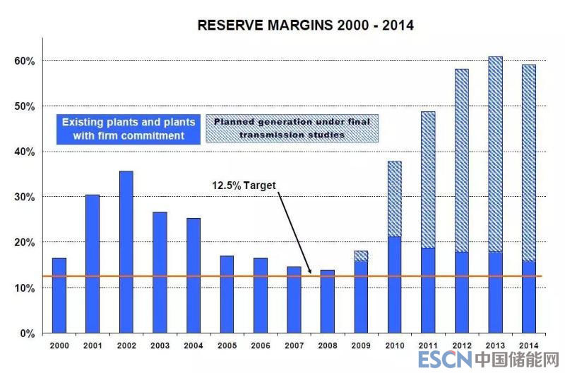 但是換句話說,德州轉(zhuǎn)型失敗了嗎?也不對,降電價從來都不是改革的目標(biāo),降電價只是整個電力系統(tǒng)效率提升的副產(chǎn)物。由于德州沒有容量市場,電廠投資積極性一直不高。隨著老舊機組的退役和用電量的增長,下圖可見,德州備用容量一度降到了警戒線附近,市場轉(zhuǎn)型后,新建裝機容量快速攀升。